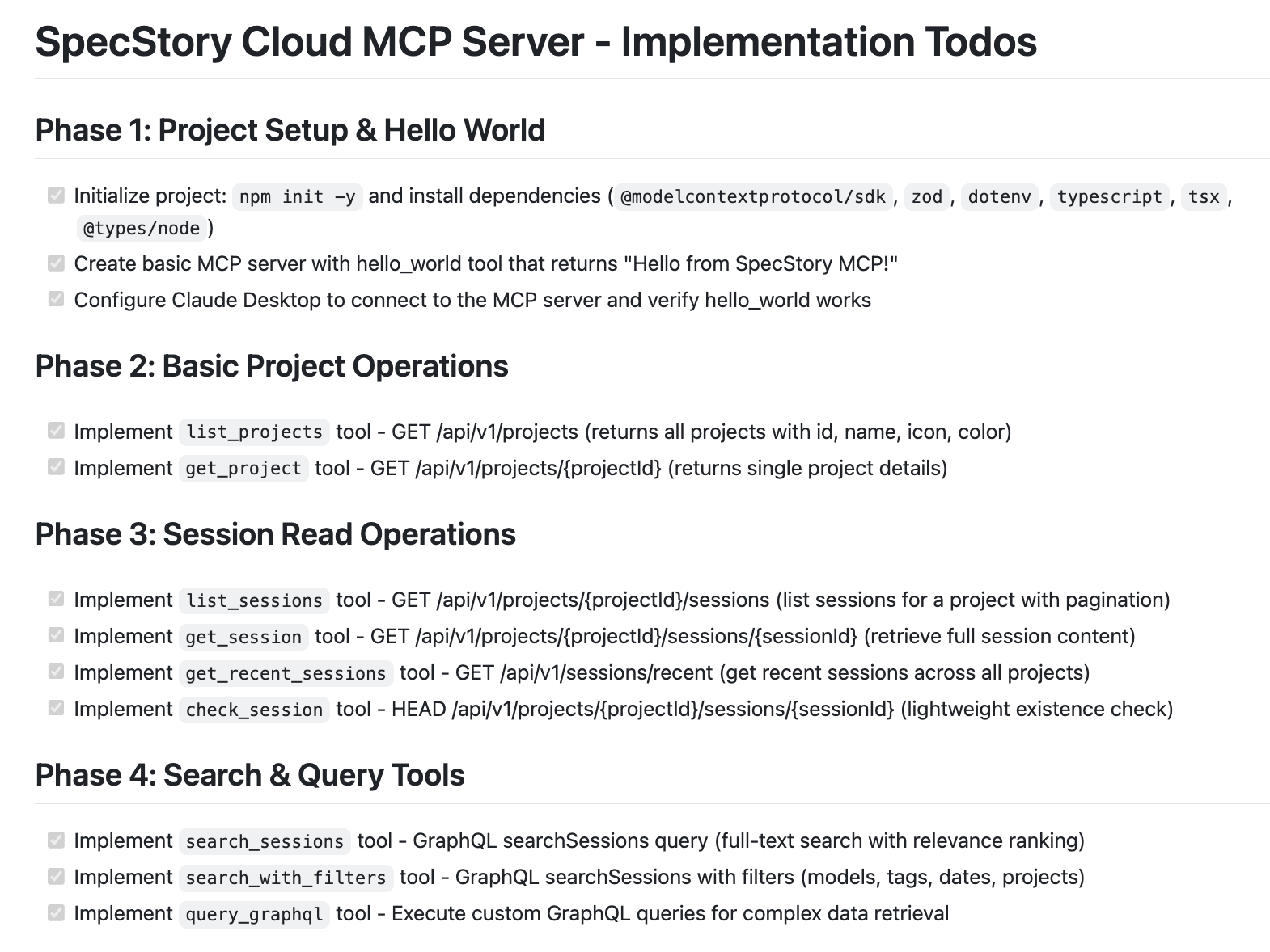 This week I was asked to create an MCP server for the SpecStory cloud. SpecStory is a tool that captures all forms of raw intent, in this case Agent Chat history to store it. Through their cloud and their API you can leverage those chats to remember and understand what decisions were made, why, and help communicate those key decisions to others.