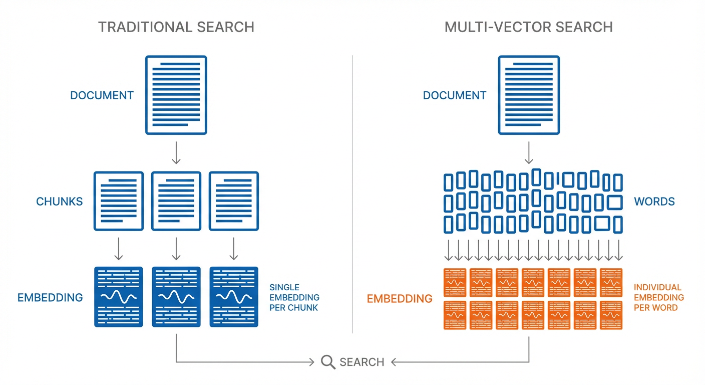 Multi-vector search is more powerful because it uses more contextual data from the inputs. The architecture stores a separate embedding for each word in a document, rather than the traditional approach of storing an entire document (or chunk) in a single embedding. This gives multi-vector approaches a more detailed understanding of the content, but it also means there's a lot more embeddings.