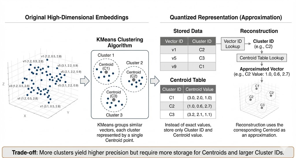 In practice it often works better to quantize vectors as a whole, instead of each number individually. This is done using a clustering algorithm like KMeans to group similar vectors. The algorithm organizes the data so that vectors with high similarity end up in the same cluster. Each cluster is then represented by a single point called a centroid. The key idea is this: instead of storing each vector’s exact values, we store two things: