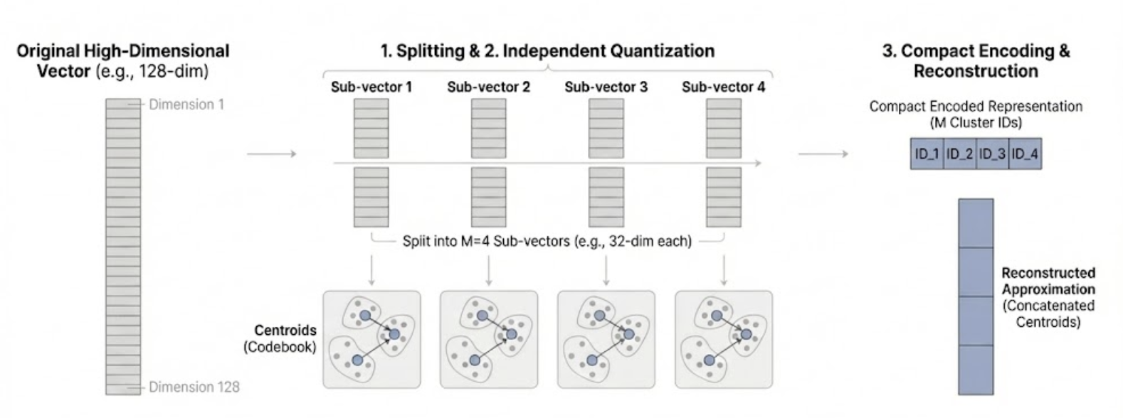 This approach, often called Vector Quantization (VQ), is a solid foundation. However, to achieve high precision, it would require a massive number of centroids, making it impractical for large-scale systems. This is where we employ a more sophisticated method: Product Quantization.
