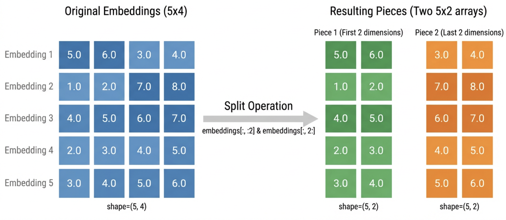 Each embedding has 4 numbers. We split it into two “pieces” of 2 numbers each: