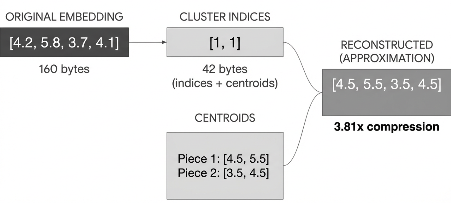 Product Quantization builds on the clustering idea but achieves far better compression by splitting each vector into smaller pieces and clustering those pieces separately.