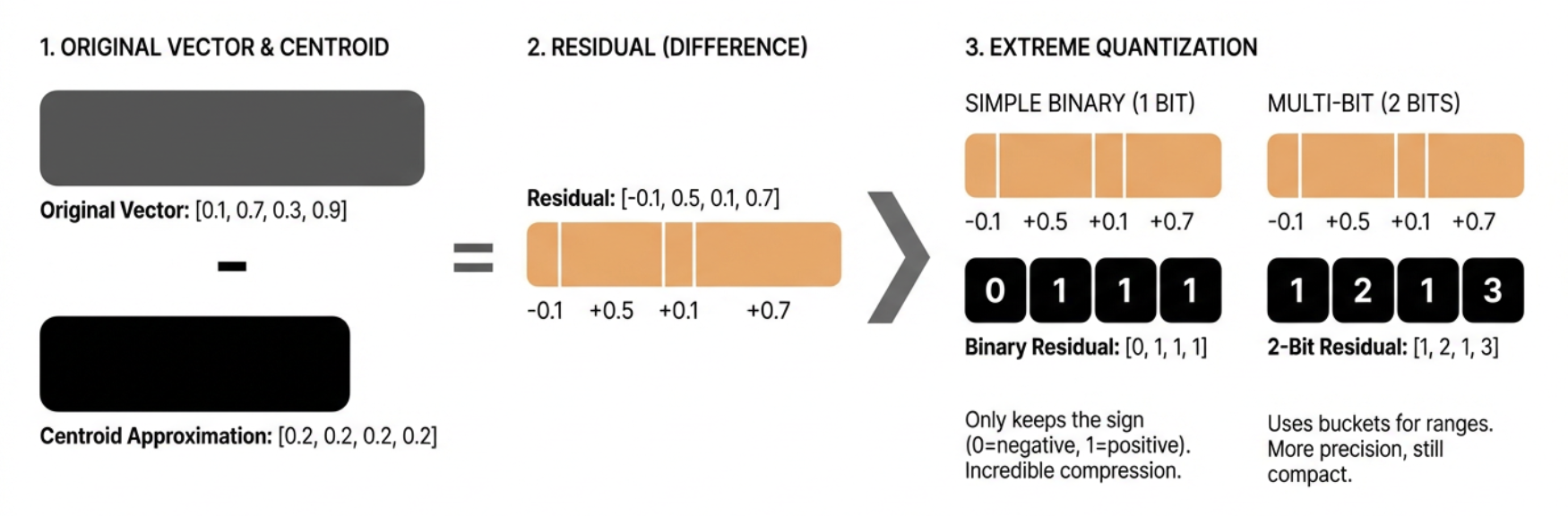 Now, instead of storing these residuals as full floating-point numbers, we can quantize them extremely aggressively. One way to do this is to use binary quantization (represent each value with a single bit).