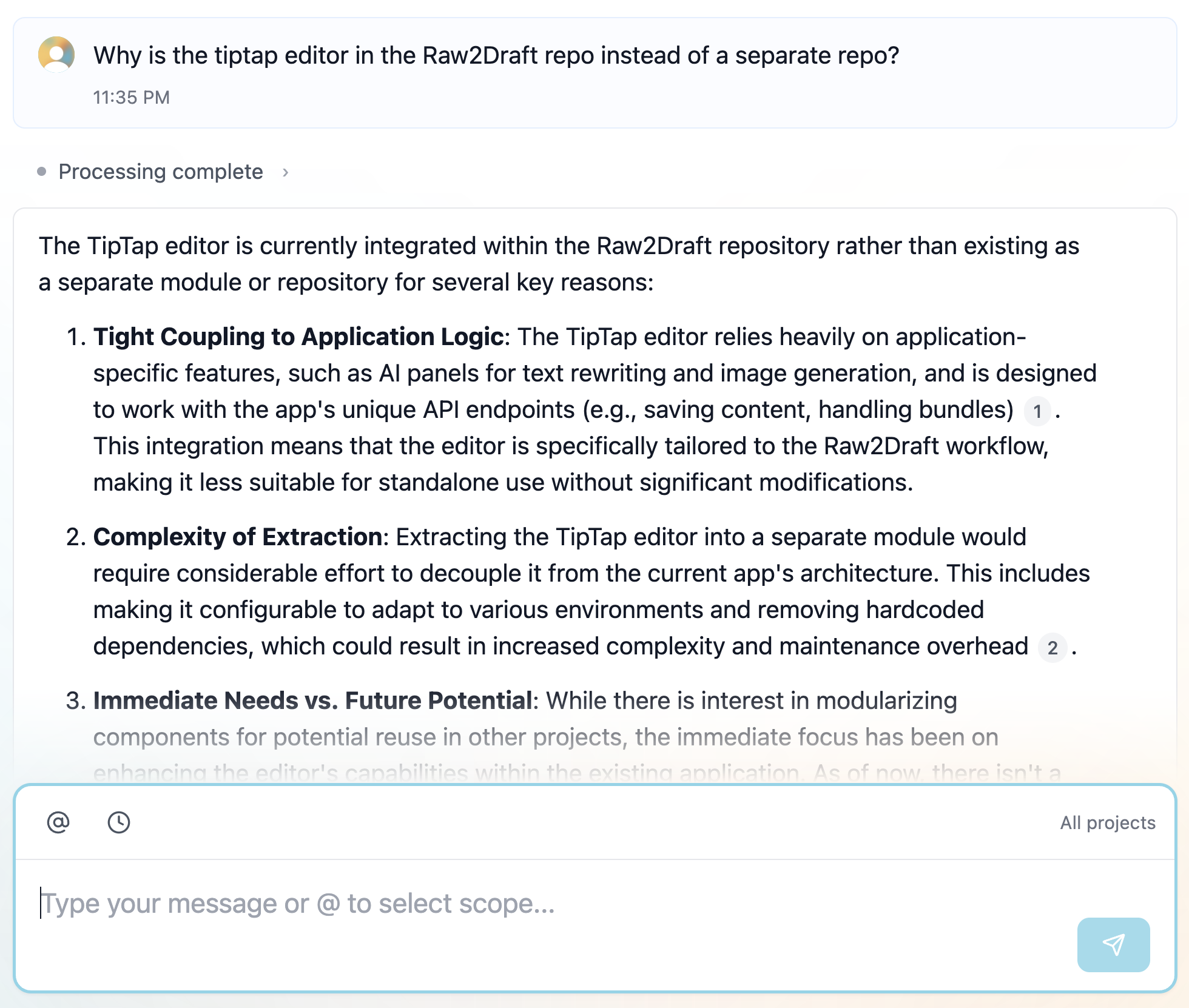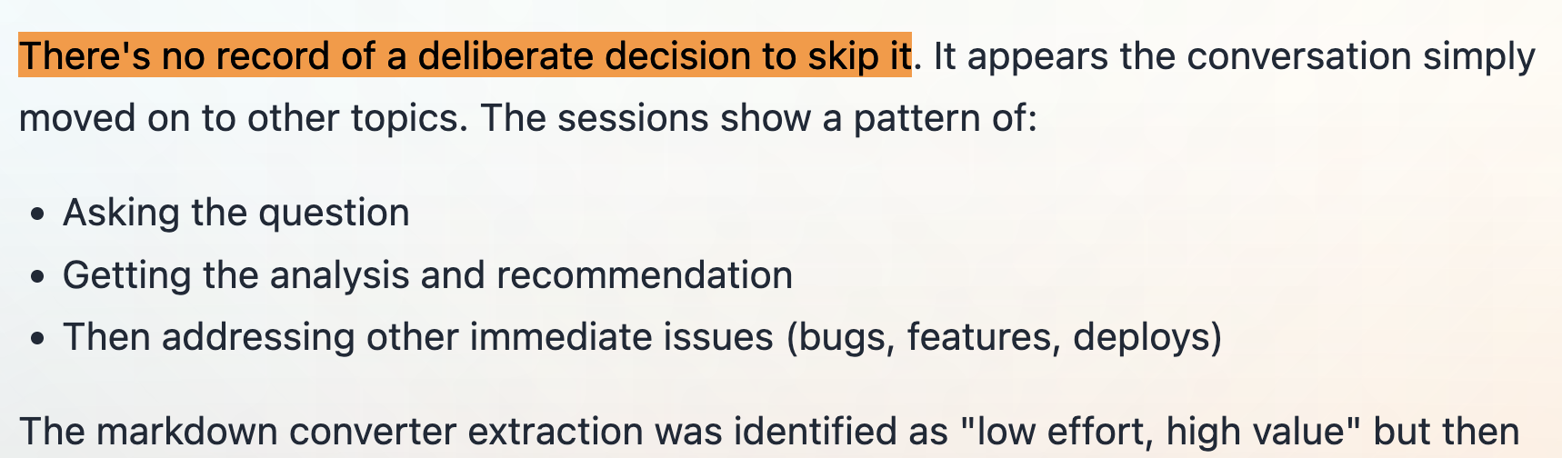 Ask "Why": The part that matters. I chat across my entire project history to understand why I made decisions.