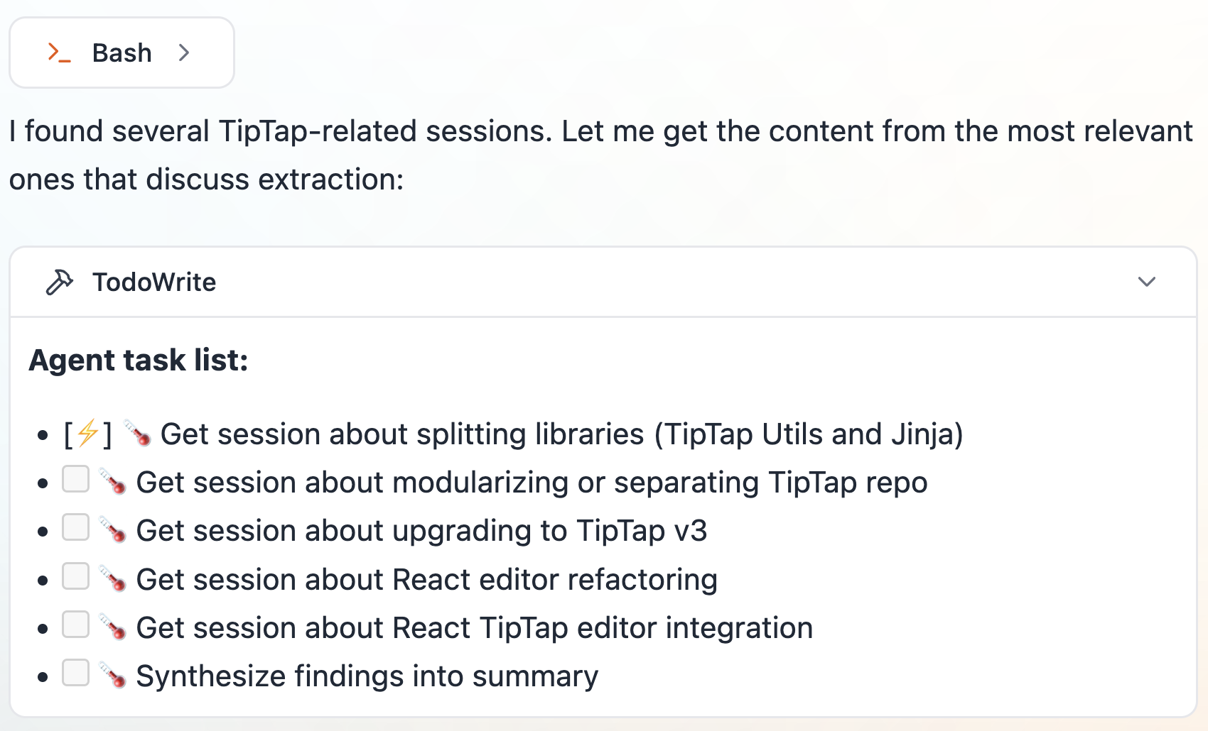 The agent fetches context on its own. It sees project history, filters sessions, and reads transcripts to answer my questions.