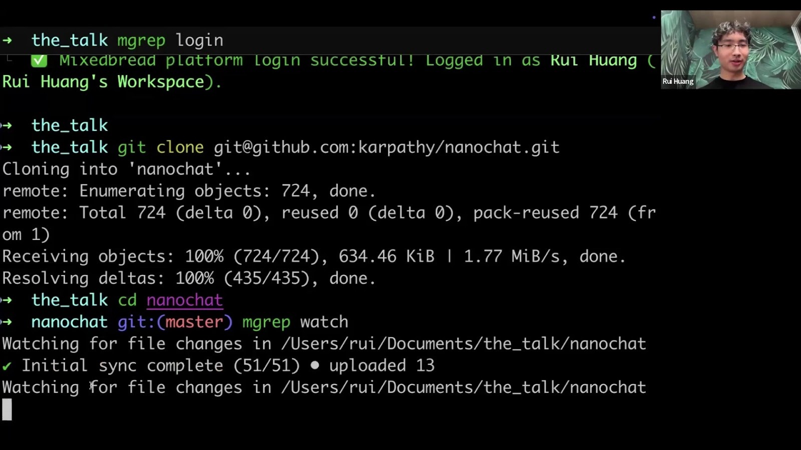 mgrep syncs a local directory to a cloud-backed search index. Rui walked through the setup.