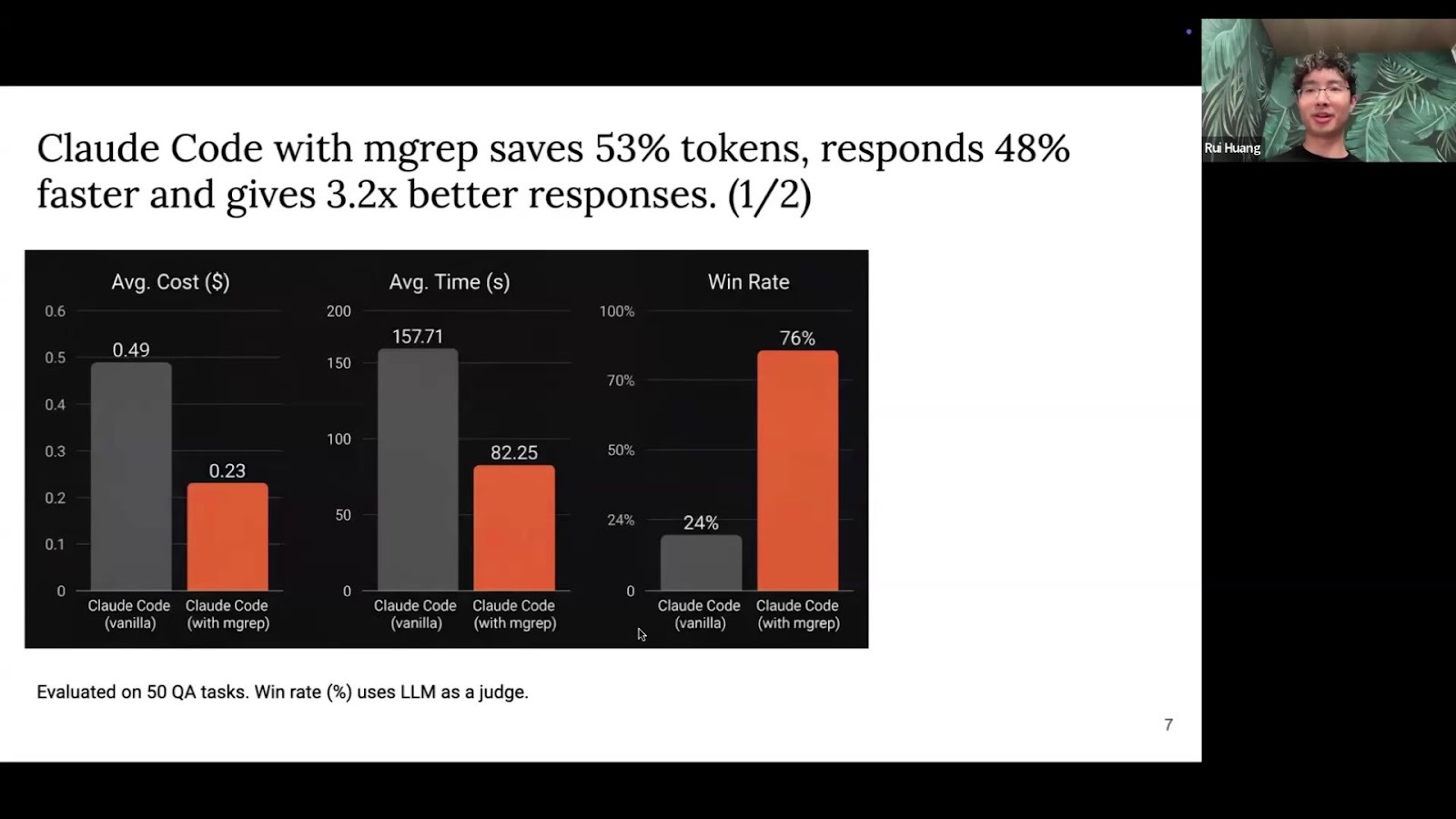 Rui's talk focused on using their semantic search technology, specifically mgrep, to build more effective coding agents. I was excited to hear from him directly, since he's on the engineering team building the product.